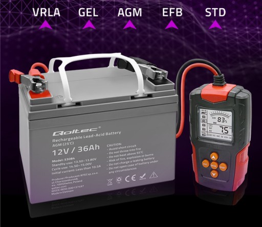 Tester baterii marki Qoltec cechuje się tym, że wykorzystuje zaawansowaną technologię testowania przewodności, by dostarczyć precyzyjne wyniki pomiarów akumulatorów AGM, GEL, VRLA, EFB, STD. Pamiętaj, nieprawidłowy odczyt wyniku testu, nie zawsze oznacza uszkodzenie akumulatora, wpływ na wynik pomiaru mogą mieć korozja i wszelkiego rodzaju zanieczyszczenia, warto więc przed pomiarem oczyścić miejsca, do których przykładasz sondy.