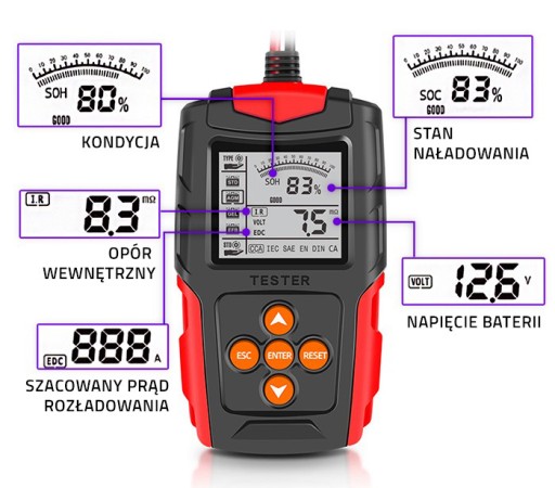 - Funkcje: Wykrywanie napięcia; Wykrywanie zasilania bateryjnego; Wykrywanie natężenia rozruchowego; Pomiar rezystancji wewnętrznej; Analiza żywotności akumulatora