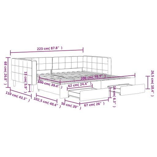 Ten rozkładany mebel 2-w-1, pełniący zarówno funkcję łóżka, jak i sofy, będzie praktycznym i przyciągającym uwagę dodatkiem do Twojego salonu lub sypialni. Uniwersalne łóżko dzienne: leżanka w ciągu dnia pełni funkcję sofy, a w nocy, po rozłożeniu z łatwością zamienia się w łóżko, zapewniając wygodne rozwiązanie do przyjmowania gości oraz maksymalizując wykorzystanie przestrzeni.Dużo miejsca do przechowywania: to łóżko dla gości zawiera dwie szuflady na kółkach, które zapewniają dużo miejsca do przechowywania ubrań, skarpet, zabawek, poduszek itp.Miękki aksamit i solidna konstrukcja: leżanka zawiera mocną ramę wykonaną z drewna i metalu oraz została obita przyjemnym w dotyku aksamitem.Nowoczesny design: sofa z funkcją spania prezentuje nowoczesny design, charakteryzujący się prostymi liniami i minimalistycznym wyglądem, dzięki czemu wprowadzi odrobinę nowoczesnego stylu do Twojego wnętrza. Warto wiedzieć:Materac nie jest dołączony. Oferujemy szeroki wybór materacy. Pasujący materac można znaleźć na naszej stronie.