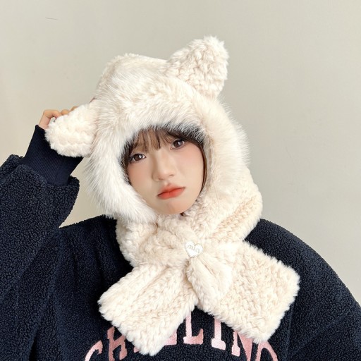 Плюшевая шапка и шарф в сочетании с теплым зимним пуловером.