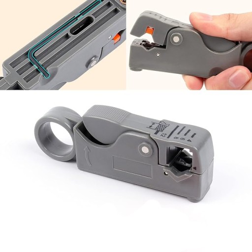 【Coaxial Cable Stripper】 Obsługa i regulacja głębokości cięcia kabla z otworem na kciuk. W pełni wymienne ostrza do idealnego ściągania izolacji z kabli, jedna strona do rg59/6, druga strona do rg7/11.