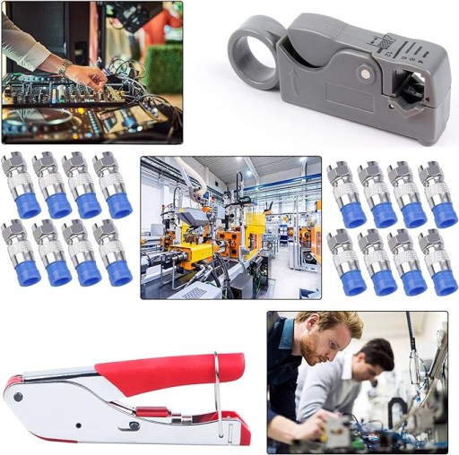 【Opakowanie】 Zestaw naprawczy kabla koncentrycznego zawiera zaciskarkę do kabli koncentrycznych, ściągacz izolacji z kabli koncentrycznych i 20 sztuk złączy kompresyjnych F, ten zestaw narzędzi kompresyjnych jest kompaktowym rozwiązaniem, lekkim i łatwym do przenoszenia!