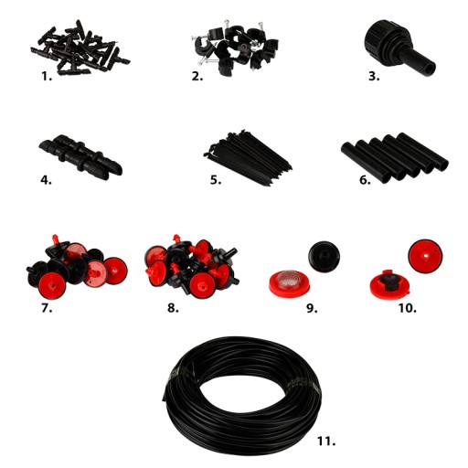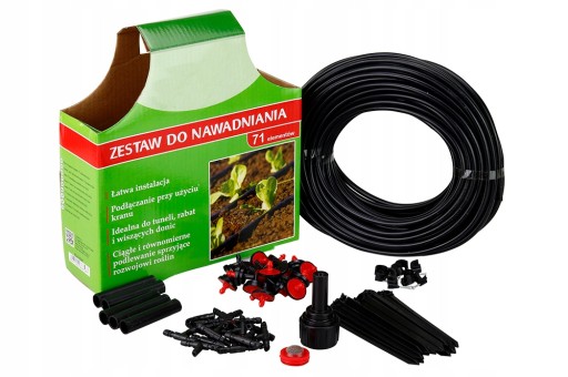 Zestaw do mikro-nawadniania kropelkowy składający się z 71 elementów.