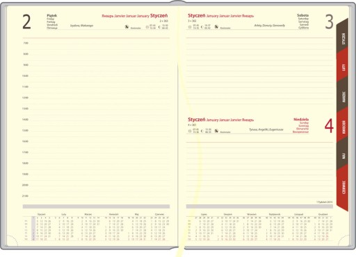 Elegancki terminarz książkowy w układzie dzienny - 1 dzień na 1 stronie, sobota i niedziela na 1 stronie, przed każdym miesiącem terminarz miesięczny.