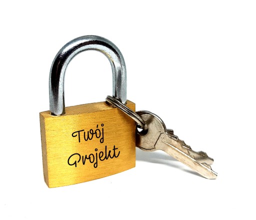 Proszę o informację, jaka grafika (jedna), tekst, który krój pisma (mogą być 2 na stronę) ma się znaleźć na kłódce. Można przesłać własną grafikę, najlepiej w wektorach.