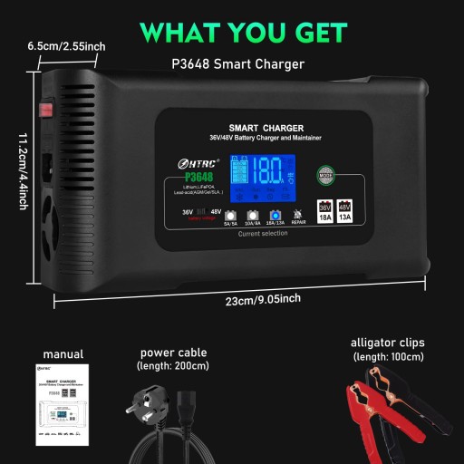 【Inteligentne szybkie ładowanie】 Maksymalny prąd ładowania wynosi 18 A dla akumulatorów 36 V i 13 A dla akumulatorów 48 V, co pozwala zaoszczędzić dużo czasu. Inteligentne 9-stopniowe ładowanie, w tym odsiarczanie, szybkie ładowanie, ładowanie podtrzymujące itp. zapewnia najlepszą wydajność ładowania. Ładowarka samochodowa automatycznie dostosowuje napięcie ładowania do temperatury otoczenia, aby uniknąć przeładowania i niedoładowania.