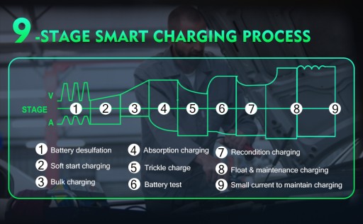 【Tryb naprawy】 Automatyczne wykrywanie zasiarczenia akumulatora i rozwarstwienia kwasu oraz naprawa starych i głęboko rozładowanych akumulatorów za pomocą najnowszej funkcji naprawy impulsowej. Zapewnia akumulatorowi większą moc do rozruchu silnika i dłuższą żywotność. UWAGA: Poważnie uszkodzonych akumulatorów nie można naprawić. Minimalne napięcie rozruchowe wynosi 26 V.