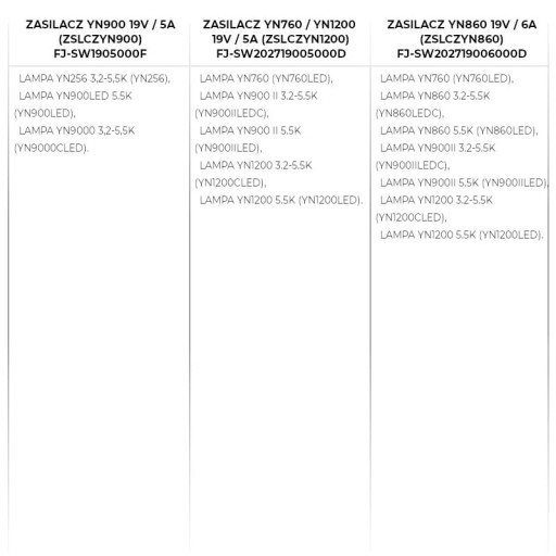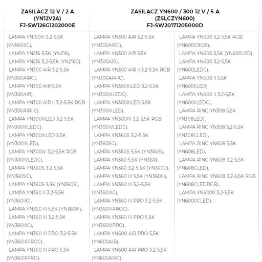 Kompatybilne zasilacze sieciowe to modele FJ-SW126G1202000E 12 V / 2 A (YN12V2A) oraz FJ-SW20171205000D 12 V / 5 A (ZSLCZYN600).