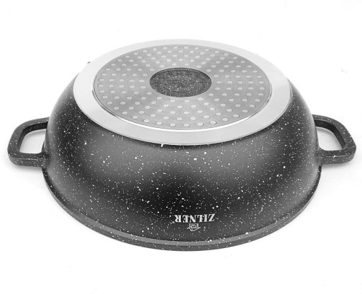Zestaw wysokiej jakości niskich garnków 3.3L / 28cm oraz 5.5L / 32 cm. Wykonane z odlewu aluminiowego pokrytego marmurową powłoką nieprzywierającą. Produkt z wytrzymałą, nieprzywieralną powłoką marmurową pozwala na zdrowe, beztłuszczowe gotowanie i łatwe mycie, a przede wszystkim chroni jedzenie przed przypaleniem. Zastosowany materiał perfekcyjnie utrzymuje i przewodzi ciepło.