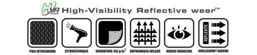 - Nadruk nanoszony metodą termodruku z wysokiej jakości folii odblaskowej, zapewnia doskonałą widoczność nawet w słabym oświetleniu.
