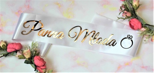 - szarfa w kolorze białym z różowo złotym lustrzanym napisem Panna Młoda