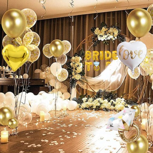 - zestaw balonów (2 białe wieczór panieński, 6 złotych i 3 złote konfetti)