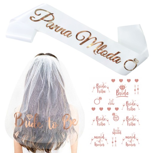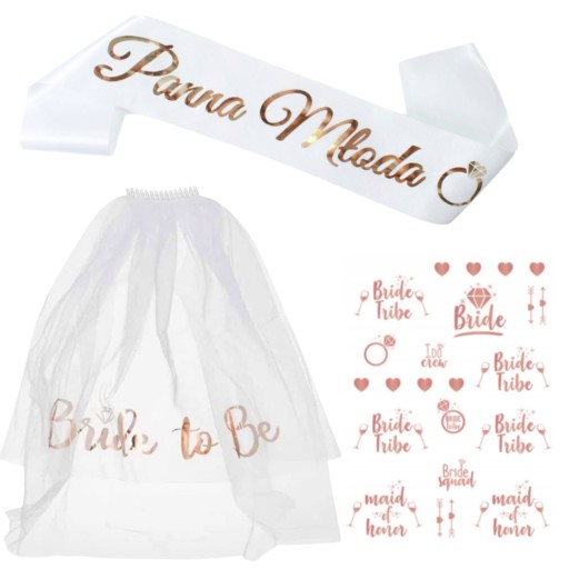 Zestaw składa się z białej szarfy z napisem Panna Młoda, opaski welonu z napisem Bride to Be oraz zestawu zmywalnych tatuaży. Świetnie sprawdzi się na Wieczorze Panieńskim. Przyszła Panna Młoda będzie mogła czuć się wyjątkowo, dzięki takiemu zestawowi. Dodatkowo zestaw może tworzyć pamiątkę z tego wyjątkowego wydarzenia. Natomiast tatuaże umilą imprezę, każdej uczestniczce.