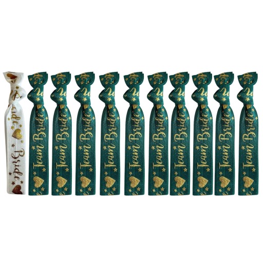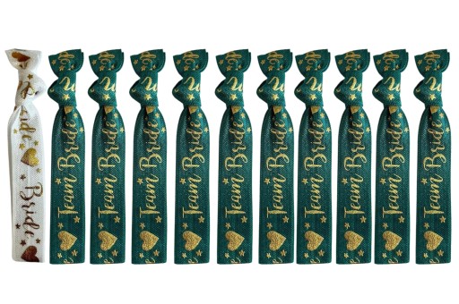 Zestaw składa się z 10 szt opasek w kolorze butelkowej zieleni z napisem Team Bride oraz 1 szt białej opaski z napisem Bride. Doskonały dodatek dla każdej Panny Młodej i jej Teamu. Drużyna Panny Młodej jest wyjątkowa i jedyna w swoim rodzaju, dlatego wyróżnij ją specjalnymi opaskami na nadgarstki. Gadżet stanowi świetną pamiątkę z wieczoru oraz nadaje się na wspólną sesję zdjęciową.