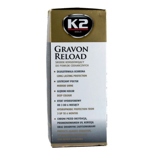 Preparat do szybkiej konserwacji powłok ceramicznych. Szczególnie zalecany do okresowego odświeżania nałożonej powłoki K2 Gravon. Wydobywa głębie koloru, zapewnia lustrzany połysk i poślizg a także posiada doskonałe właściwości hydrofobowe. Może być stosowany na plastiki, gumę, szkło a także na lakier bez powłoki. Niweluje ryzyko powstawania małych rys.