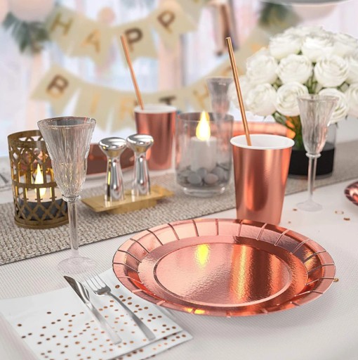 Podczas Wieczoru Panieńskiego każdy detal ma znaczenie. Dlatego talerzyki papierowe w kolorze rose gold są idealnym wyborem na tę okazję. Kupując ten zestaw dbasz o środowisko.