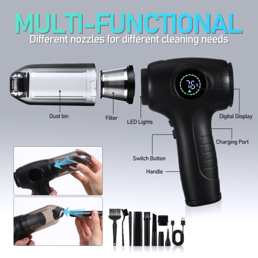 - ✅ Wielofunkcyjny: Odkurzacz samochodowy może zarówno wydmuchiwać, jak i zasysać kurz oraz zanieczyszczenia, co ułatwia utrzymanie czystości na każdej powierzchni.