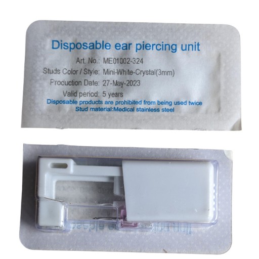 Sterylny jednorazowego użytku aparat wraz z kolczykiem do przekłucia płatka ucha.