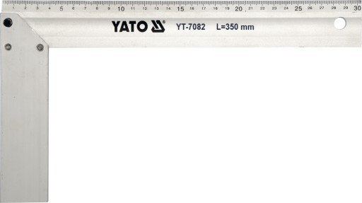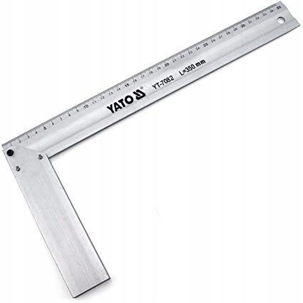 Kątownik pomiarowy renomowanej marki YATO ze stopką długość 350 mm. Wykonany z utwardzanego aluminium. Podziałka milimetrowa naniesiona w sposób trwały w kolorze czarnym.