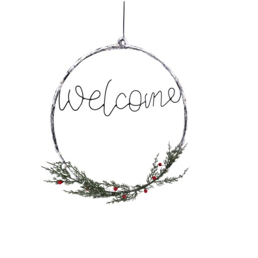 Dekoracja wisząca w formie wianka z czarnego drutu metalowego o średnicy 40 cm z napisem "WELCOME" z oświetleniem LED.