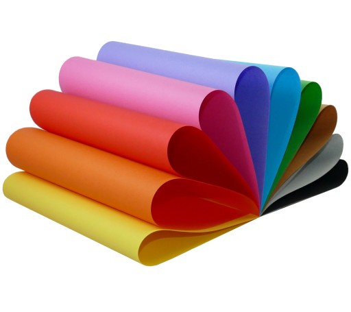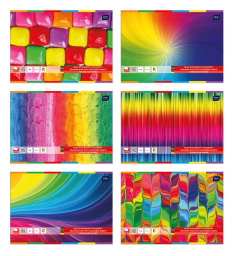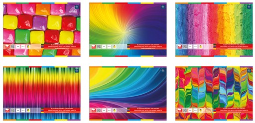 Blok rysunkowy kolorowy barwiony w masie, dzięki czemu kolory są żywsze a po podarciu nie ma białych strzępów.