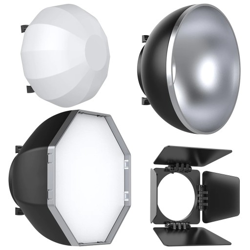 ✔️ Bogaty zestaw - statyw, modyfikator 4-listny typu „wrota”, odbłyśnik zmiękczający, softbox kulisty, dyfuzor ośmiokątny oraz przewód zasilający.