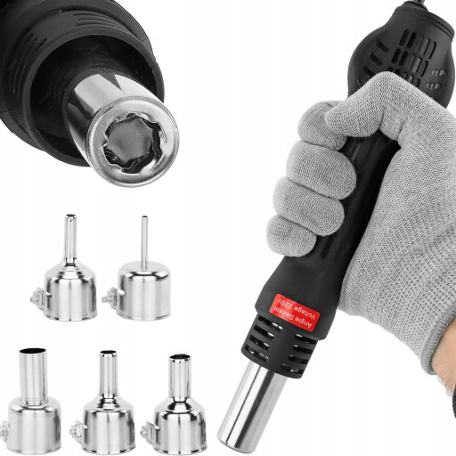 Stacja została wyposażona w ergonomiczną kolbę na gorące powietrze oraz w 5 wymiennych dysz.