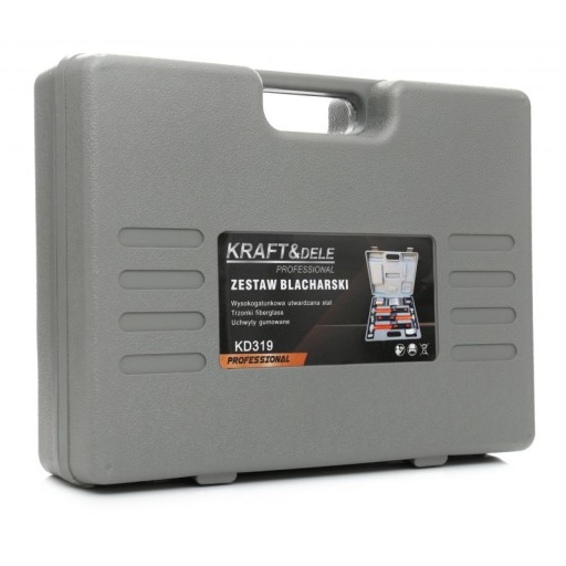Zestaw blacharski o symbolu KD319 marki Kraft&Dele zawiera 4 kowadełka (wypukłe. hacelowe, łukowe i wielozadaniowe), a także 3 młotki o charakterystycznych płaszczyznach roboczych z profilowaną rękojeścią z włókna szklanego Fiberglass (dodatkowo pokryte gumową powłoką)