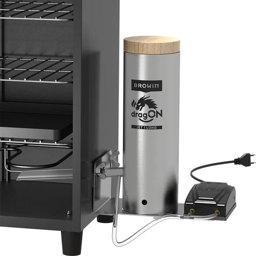 Pompka wtłaczająca powietrze podłączana jest za pomocą wężyka do zintegrowanej z dyszą rurki kątowej. Wydajność pompki można regulować pokrętłem, dostosowując ilość dymu do potrzeb i objętości wędzarni.