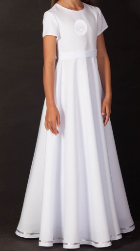 Alba dla dziewczynki na miarę Oktawia srebrna. Alba komunijna z paskiem w talii, z kokardką z tyłu. Krótki rękaw,srebrna naszyta hostia. Dół alby ozdobiony srebrną taśmą. Wygląda bardzo dziewczęco i subtelnie.