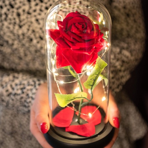 Róża wygląda ultra realistycznie, do złudzenia przypomina prawdziwy kwiat. Efekt wizualny - połączenie szklanego klosza, światła i kwiatu, robi duże wrażenie i nasuwa na myśl bajkowy klimat.