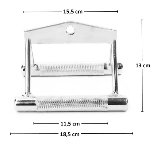 Specyfikacja: Materiał: chromowana stal Długość części chwytnej (mm): 115 Średnica części chwytnej (mm): 25 Ilość miejsc chwytnych: 2 Rozstaw rękojeści (mm): 150 Uchwyt: radełkowany Wymiary: długość (mm): 185 szerokość (mm): 170 wysokość (mm): 120 średnica (mm): 10 Średnica otworu (mm): 15 Waga produktu (kg): 2.18 Uwagi: Gwarancja 24 miesiące