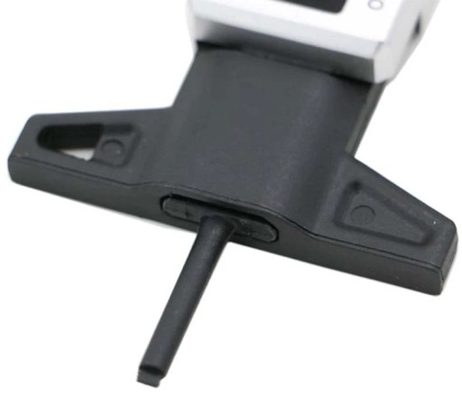 - Załóż miernik na oponę, przytrzymaj stabilnie i wciśnij końcówkę prowadnicy w profil opony