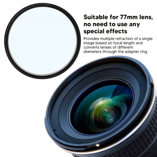 5. Elastyczne zastosowanie: nasz pryzmat kamery kalejdoskopowej zapewnia wielokrotne załamanie pojedynczego obrazu w zależności od ogniskowej, a przez pierścień pośredniczący można konwertować soczewki o różnych średnicach, a efekt jest inny przy różnych ogniskowych, zalecane zakres przysłony do fotografowania wynosi od 2,8 do 7,0.