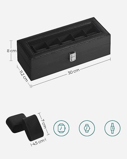 Aksamitna podszewka wewn?trz pude?ka na zegarki zapewnia mi?kkie ?ó?ko dla Twoich skarbów i zapobiega ich zarysowaniu Owiń swoje zegarki ciasno wokó? poduszek, aby utrzyma? je w dobrym stanie Pude?ko na zegarki jest odpowiednie dla tarcz o ?rednicy do 5 cm