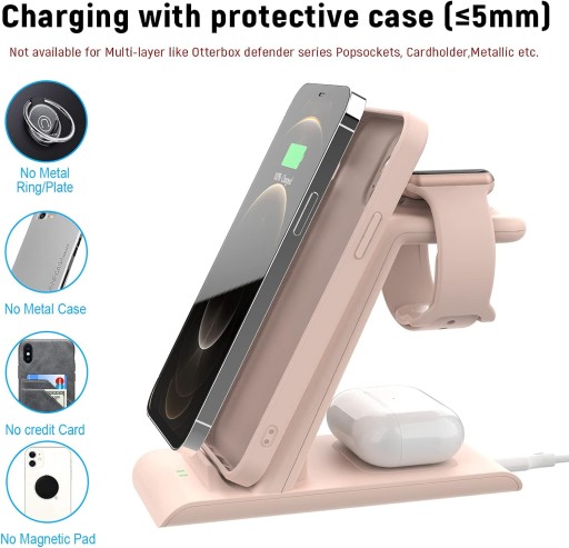 • Kompatybilność: Kompatybilny z Apple iPhone 15/14/13/12/Pro/Pro Max//XR/X/XS/XS Max/11 pro Max/11/8 plus/8, Apple Watch Ultra/Ultra 2/Seria 9 8 7 41mm/45mm/6/5/4/3/2/SE, AirPods 3. generacji/Pro/2/seria Galaxy Buds/Z Flip/S 20 Ultra/S20+/S10+/S22 Ultra/S22/S22+/Note10/ Note10+ i inne telefony z obsługą Qi. Nie jest kompatybilny z ładowarką iPhone 12/13 mini, nie jest kompatybilny z ładowarką Magsafe do iPhone'a 13/12. [Uwaga: iPhone 14 Pro należy ładować poziomo, ponieważ moduł obiektywu jest za duży.]