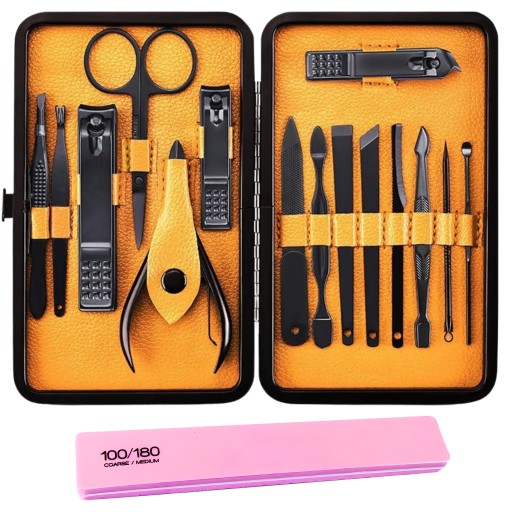 Zestaw 15 wysokiej klasy narzędzi do pielęgnacji paznokci ze stali nierdzewnej, zapakowanych w luksusową, skórzaną torbę podróżną, stanowi idealne połączenie stylu i praktyczności.