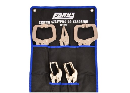 Specjalny zestaw szczypiec samozaciskowych dla blacharza. Zestaw składa się z 16 elementów.