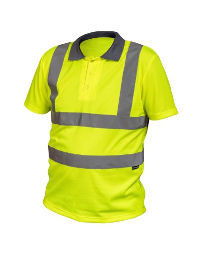 Ostrzegawcza koszulka polo. Wykonana z wysokiej jakości poliestru, który jest przewiewny i miły w dotyku. Polo z kołnierzykiem z plisą zapinaną na guziki. Luźny krój nie opina sylwetki i zapewnia pełną swobodę ruchów. Koszulka posiada 2 taśmy odblaskowe dookoła korpusu i 2 taśmy odblaskowe na ramionach, które zapewniają widoczność w niesprzyjających warunkach. Żółta odzież ochronna ma szerokie zastosowanie w transporcie drogowym, przemyśle i usługach.