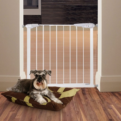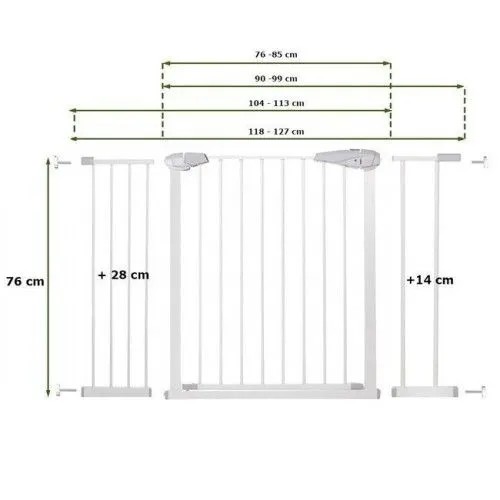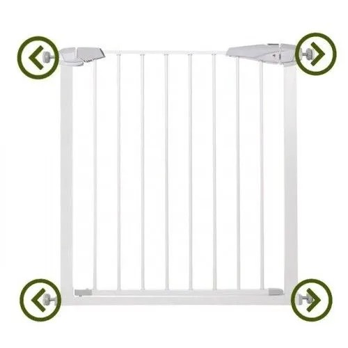 Bezpieczna, solidna bramka zabezpieczająca dla dzieci lub dla małych i średnich zwierząt. Bramka może oddzielać określone obszary w domu, niebezpieczne dla naszych pociech. Zabezpiecza schody bądź drzwi przed niekontrolowanym wejściem przez dzieci. Bramka mocowana jest rozporowo za pomocą specjalnych śrub, dzięki czemu montaż, jak i demontaż jest niezwykle prosty i szybki. Regulacja pozwala zamontować bramkę pomiędzy futrynami o szerokości 76-99 cm. Na innych aukcjach istnieje możliwość poszerzenia o dodatkowe elementy.