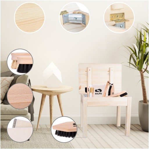 Solidny zestaw szczotek SULPO z włosiem końskim, umieszczonych w drewnianym sosnowym taborecie. Będzie łączył użyteczność oraz element dekoracyjny Twojego domu, mieszkania. Proponowany przez nas zestaw do pielęgnacji obuwia zawiera wszystko, co jest potrzebne do właściwego czyszczenia butów. Jeśli zależy Ci na utrzymaniu swojego obuwia w nieskazitelnym stanie i prezentowaniu się zawsze elegancko, to właśnie znalazłeś idealne narzędzie.