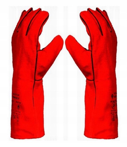 Rękawice spawalnicze, bardzo dobrej jakości, wykonane są ze skóry dwoiny bydlęcej z czarnymi lamówkami wzdłuż przeszyć.