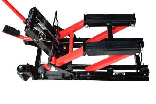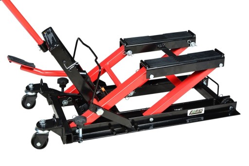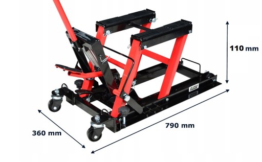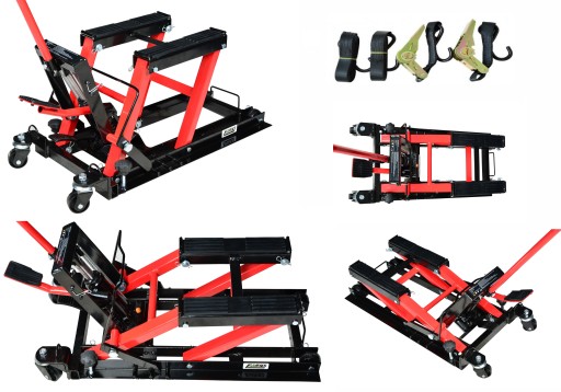 Dzięki niemu podniesiesz motocykl, quada lub inne pojazdy tego typu. Wysoka jakość wykonania, posiada dwa skrętne kółka i śruby stabilizujące. Wyposażony jest w dwie niezależne dźwignie do podnoszenia i opuszczania. Podnośnik wyposażony w blokadę która umożliwia zablokowanie opuszczania uniesionego pojazdu. Podnośnik naszej firmy umożliwia podniesienie do wysokości aż 40 cm. W zestawie dwa pasy zabezpieczające gratis !
