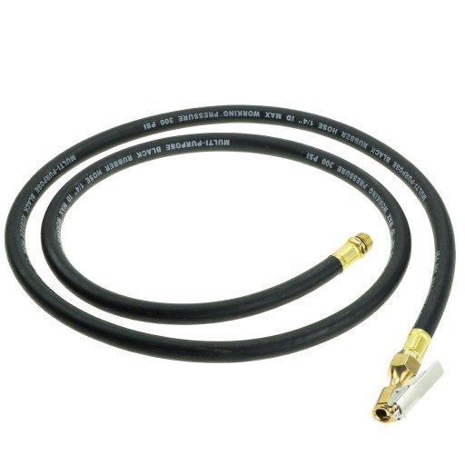 🔹 Wąż pompujący o długości 150 cm na maks. ciśnienie 300 psi (20 bar), zakończony mosiężną końcówką zaciskową.