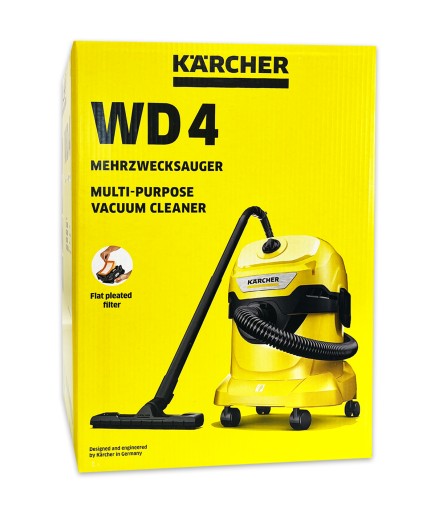 Wysoka moc zasysania i energooszczędność przy poborze mocy jedynie 1000 watów. Dzięki doskonałemu dopasowaniu ssawki podłogowej, węża ssącego i urządzenia, możliwe jest osiągnięcie doskonałych rezultatów czyszczenia oraz usuwanie mokrych, suchych, drobnych i dużych zanieczyszczeń bez przerw w pracy oraz konieczności wymiany filtra. Urządzenie WD 4 V-20/5/22 zostało wyposażone w solidny, odporny na uderzenia zbiornik z tworzywa sztucznego o pojemności 20 litrów, 5-metrowy przewód zasilający, a także wąż ssący o długości 2,2 m, płaski filtr falisty oraz fizelinową torebkę filtracyjną. Dzięki opatentowanej technologii można łatwo i szybko wyjąć filtr z odkurzacza - bez kontaktu z zanieczyszczeniami. Wypinane kolanko umożliwia podłączanie ssawek bezpośrednio do węża ssącego. Wąż ssący można przechowywać na głowicy urządzenia. W razie potrzeby głowica urządzenia posiada również miejsce do przechowywania małych części. Pozycja parking na listwie odbojowej odkurzacza umożliwia szybkie i wygodne odłożenie rur i ssawki podłogowej. Pozostałe zalety to: system zamykania „Pull & Push”, który umożliwia proste otwieranie i zamykanie zbiornika jak również ergonomiczny uchwyt do przenoszenia ułatwiający transportowanie urządzenia.