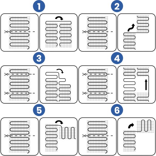 Przecinamy siatkę podkładową w wybranym miejscu i zmieniamy kierunek ułożenia maty grzewczej, obracając resztę maty o 180° względem jej osi.