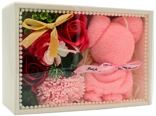 ЦВЕТОЧНАЯ КОРОБКА МЫЛО ЦВЕТЫ РОЗЫ + РОЗОВЫЙ МИШКА