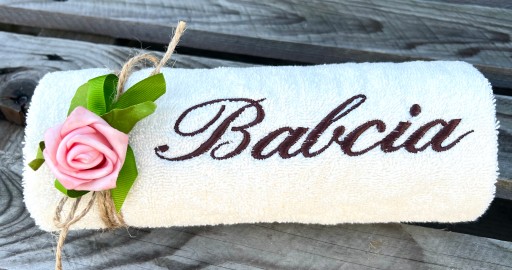 - gruby i miękki ręcznik łazienkowy 50x100 cm w kolorze ecru z napisem w kolorze brązowym Babcia,