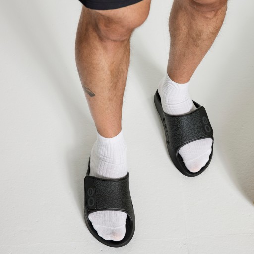 Klapki OOFOS OOahh Sport Flex Black Labirynth to sportowy model z regulowanym paskiem, który zapewnia idealne dopasowanie do stopy. Dzięki technologii OOfoam, amortyzującej wstrząsy o 37% lepiej niż tradycyjna pianka EVA, zmniejszają obciążenia przenoszone na stawy i mięśnie, co pozwala na szybszą regenerację.