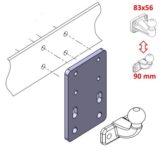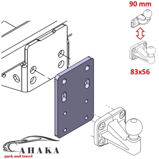 Przy użyciu tego artykułu kule na dwie śruby o rozstawie otworów 90mm możesz zamontować w haku holowniczym przystosowanym do kuli na cztery śruby o rozstawie otworów 83x56mm, a kulę na cztery śruby o rozstawie 83x56mm możesz zamontować w haku przystosowanym do kuli na dwie śruby o rozstawie otworów 90mm.